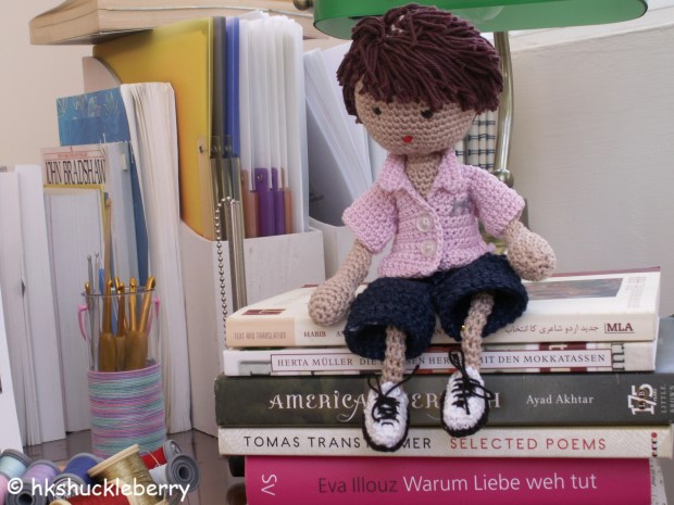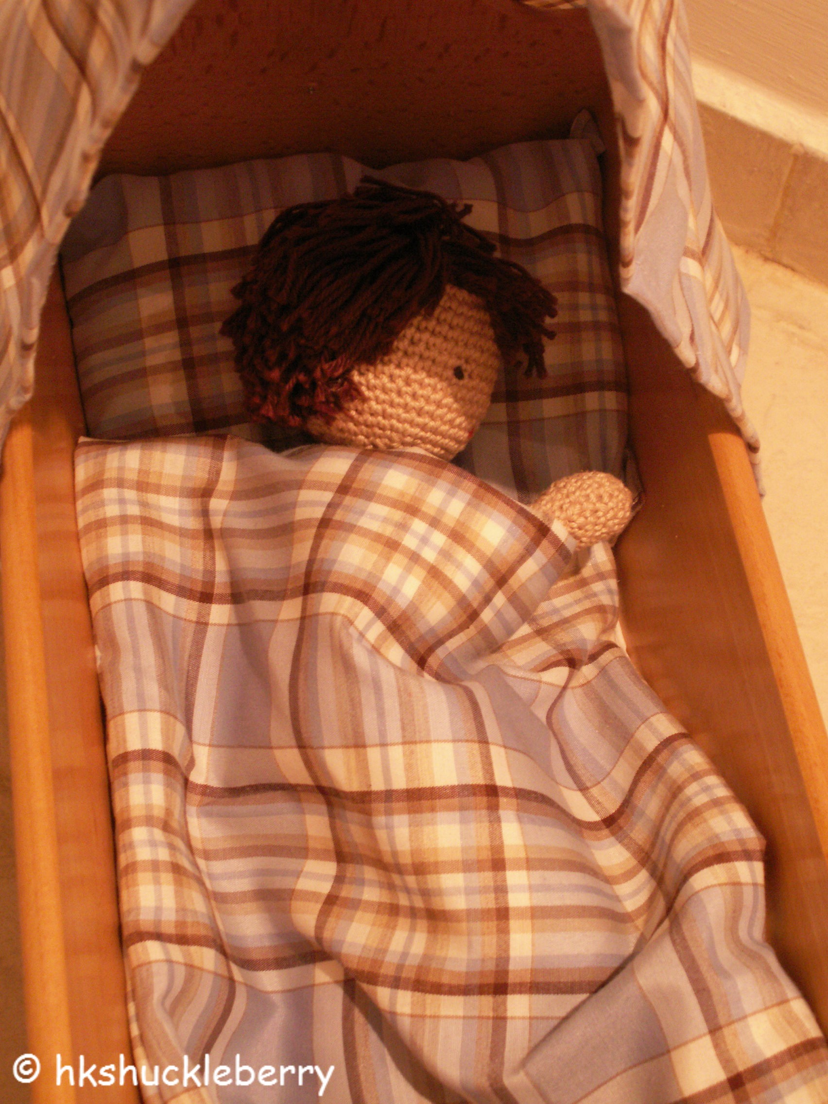 I started to look for a suitable fabric for my little crocheted friend while he continued listing the colors and patterns that he considered unacceptable. After some serious searching I found a piece of light blue and brown plaid fabric.