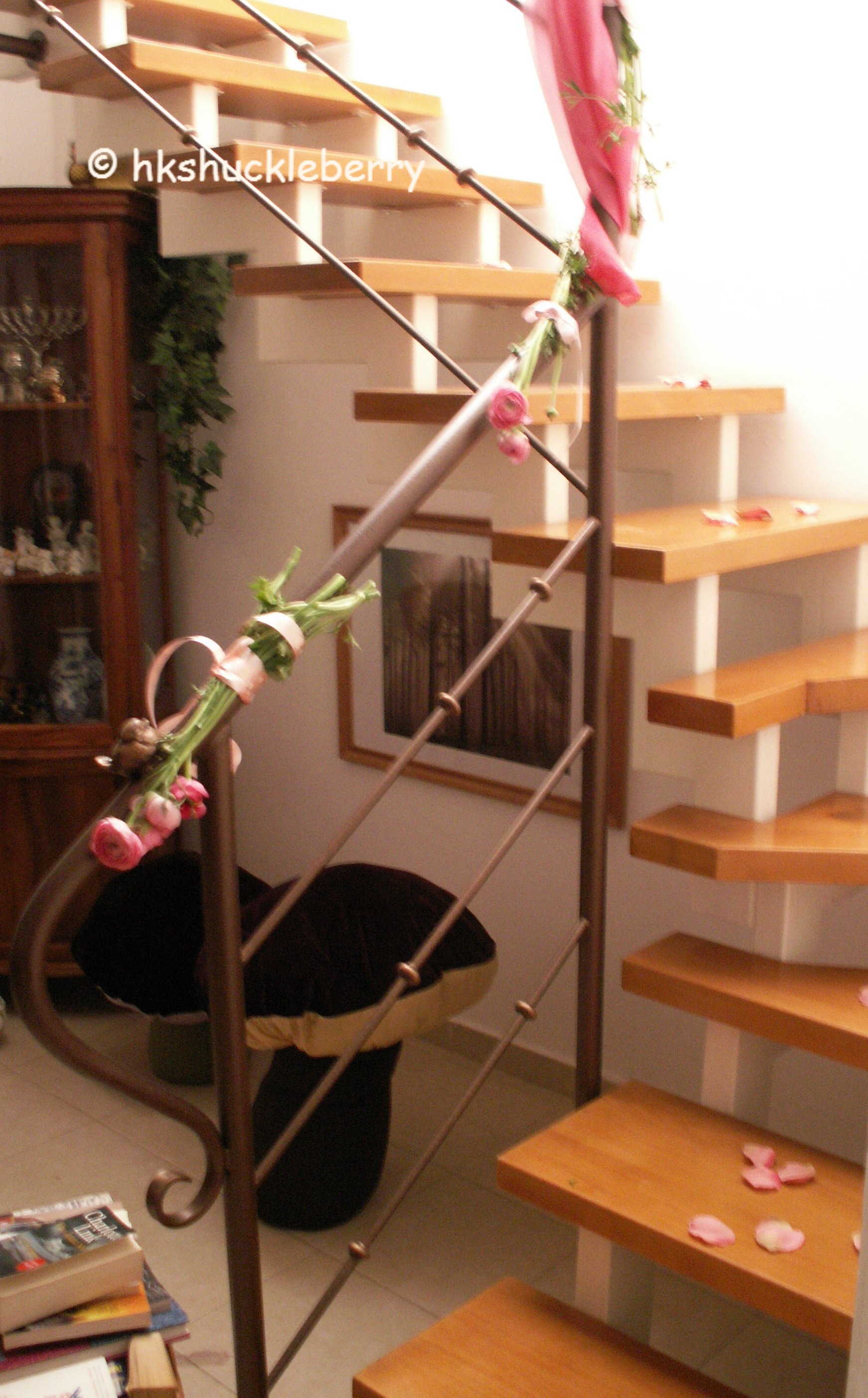 I decide to look for him upstairs. I have a feeling something is going on, I just do not know what it is. I walk down the hall and as I reach the staircase my suspicions are being confirmed. Tied to the banister with pink ribbon is a bunch of pink Persian Buttercup and scattered on the steps are pink petals.