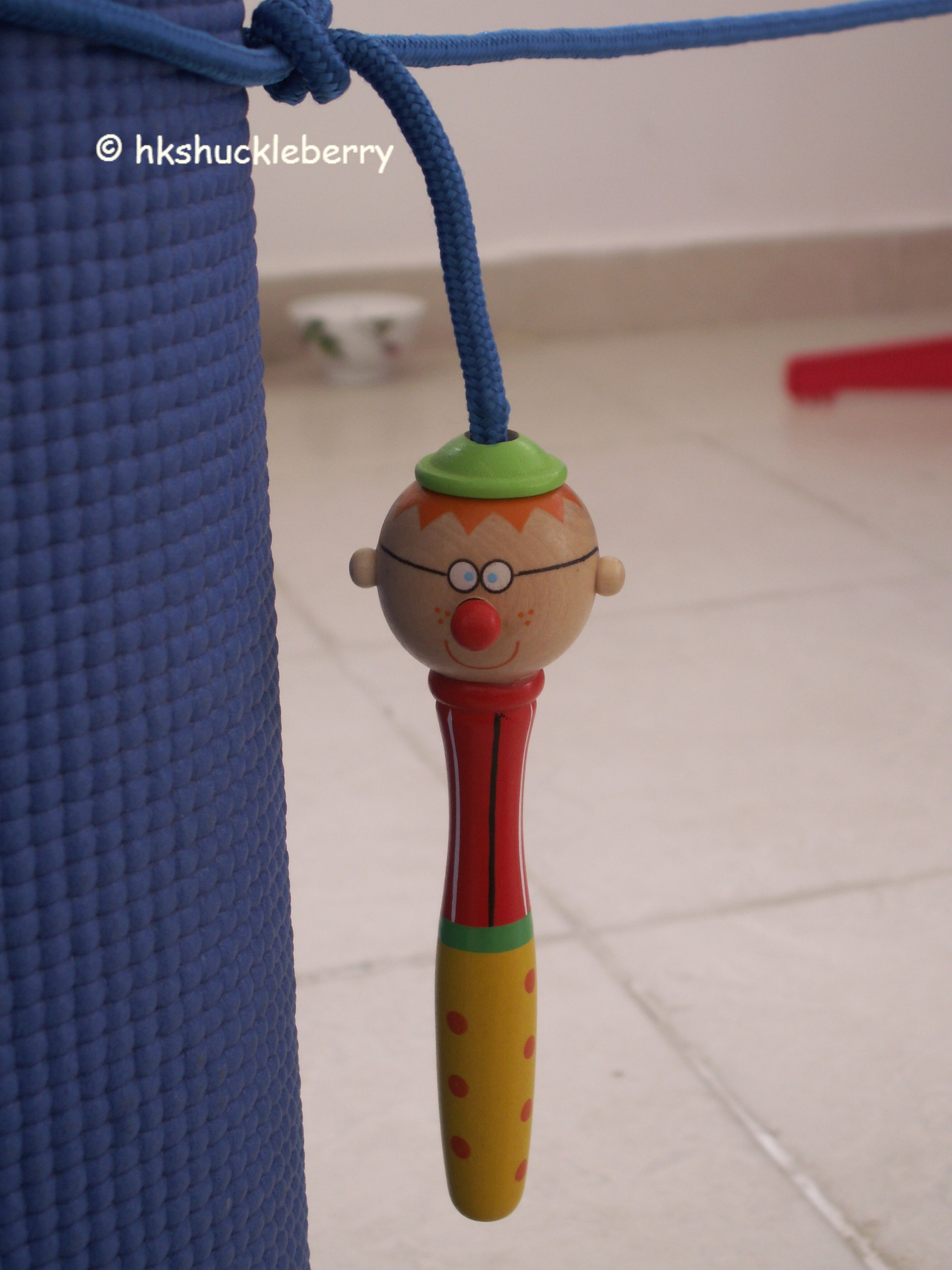 ” Ok guys, you are going to help me with this.” Pomi grabs Mr.Left and Mr.Right and ties them each around one mat.