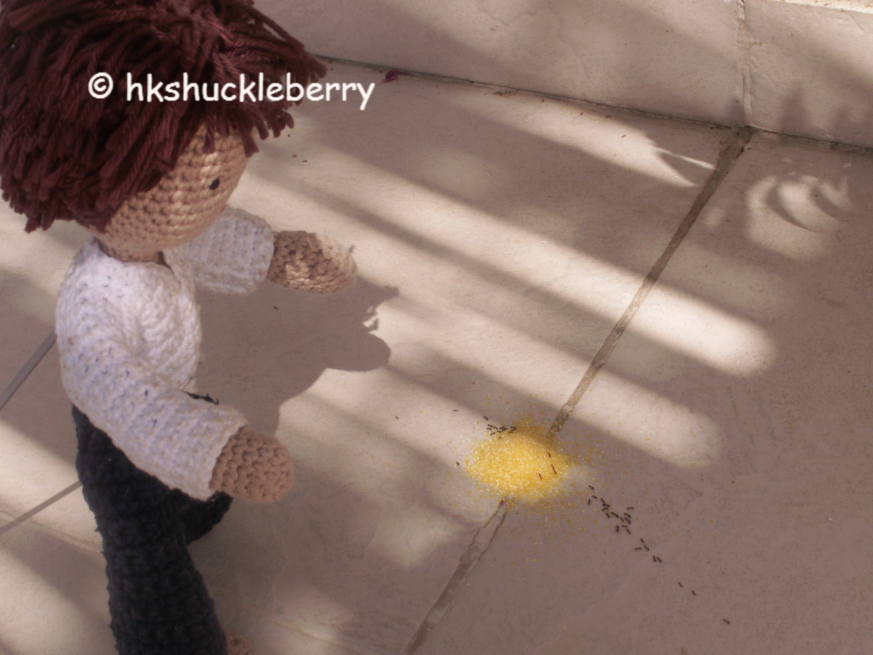 ” Of course I am sure. Look, they love it.” Pomi had put a handful of cornmeal on the floor and almost immediately the insects were drawn to the yellow granules.
